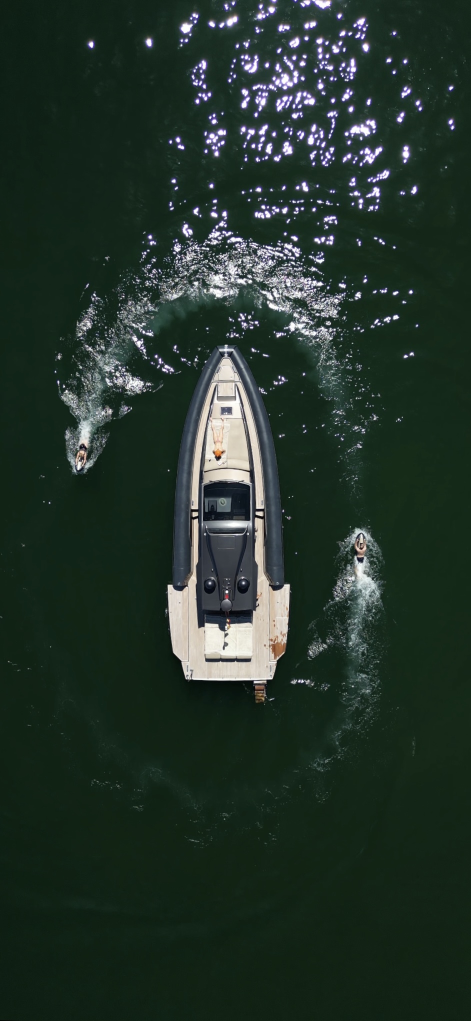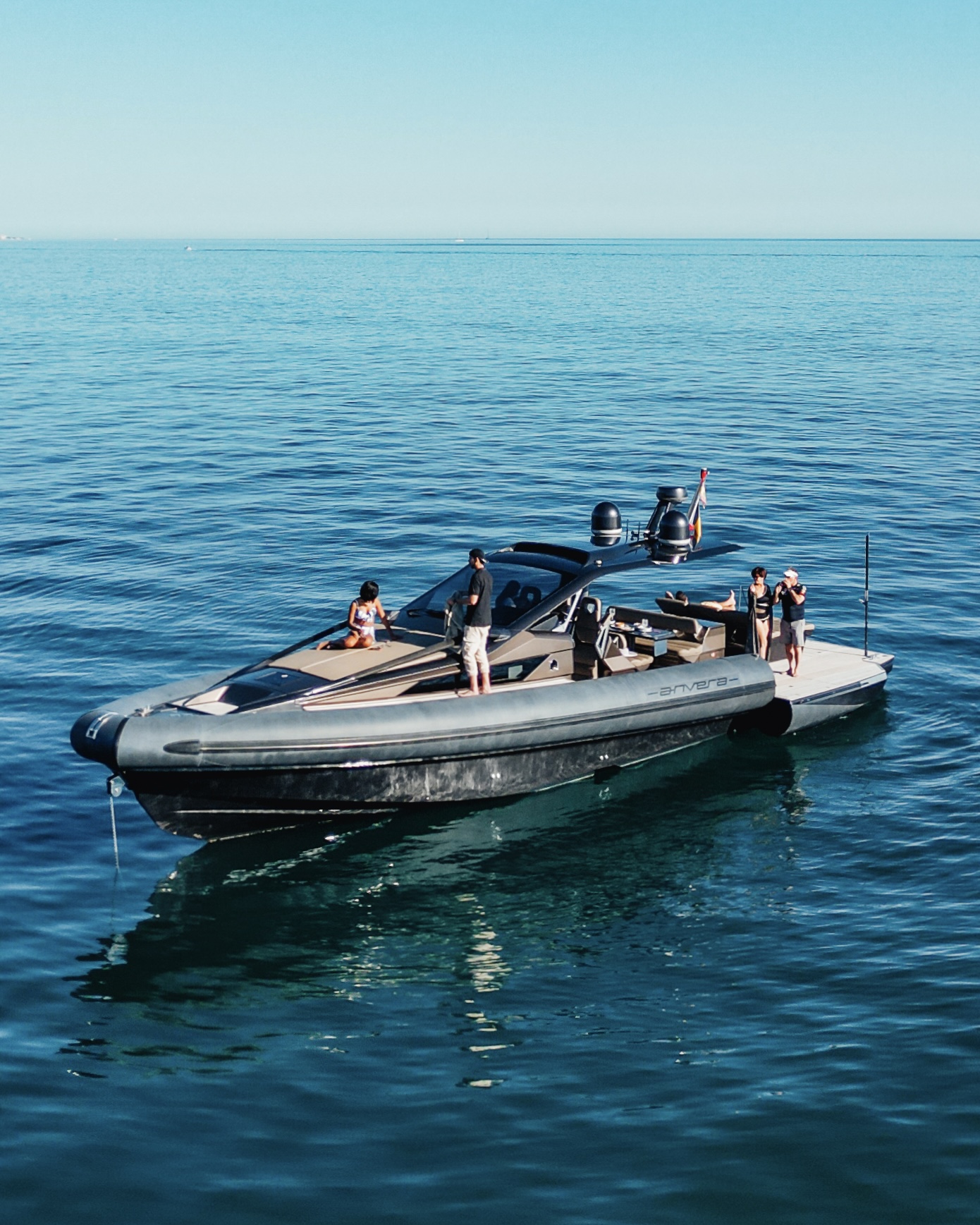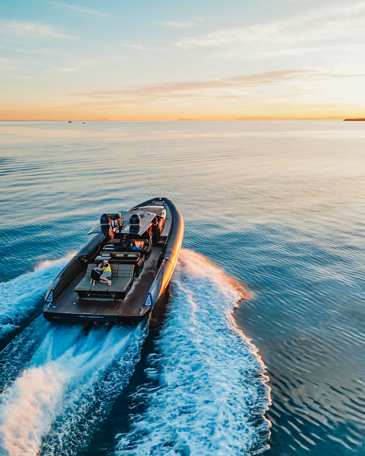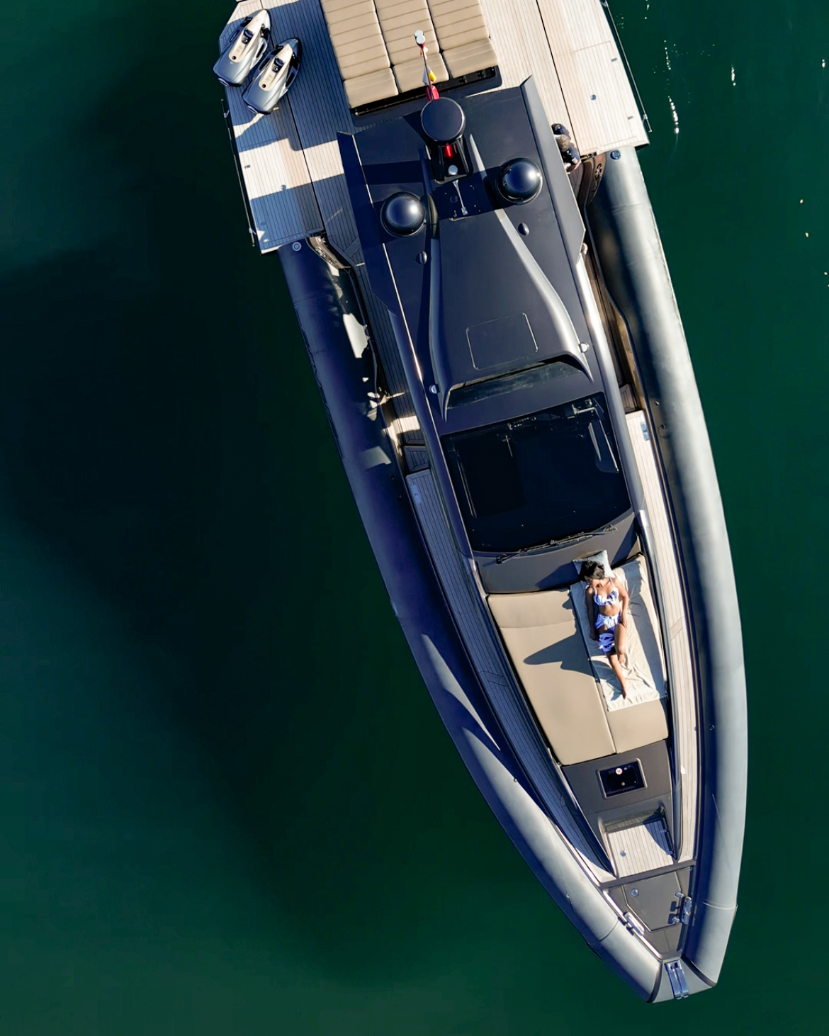 Una longitud de 15 metros, con asientos y solarium en popa, un gran solarium de proa.